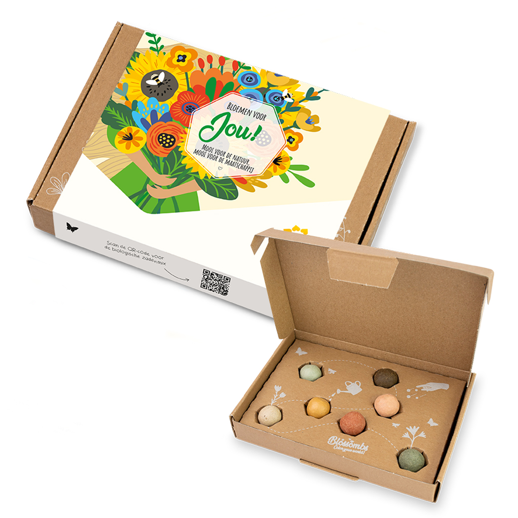 Dit kleurige doosje met 7 bloembommetjes van Blossombs kunt u gebruiken om uit te strooien in uw tuin of cadeau te doen.