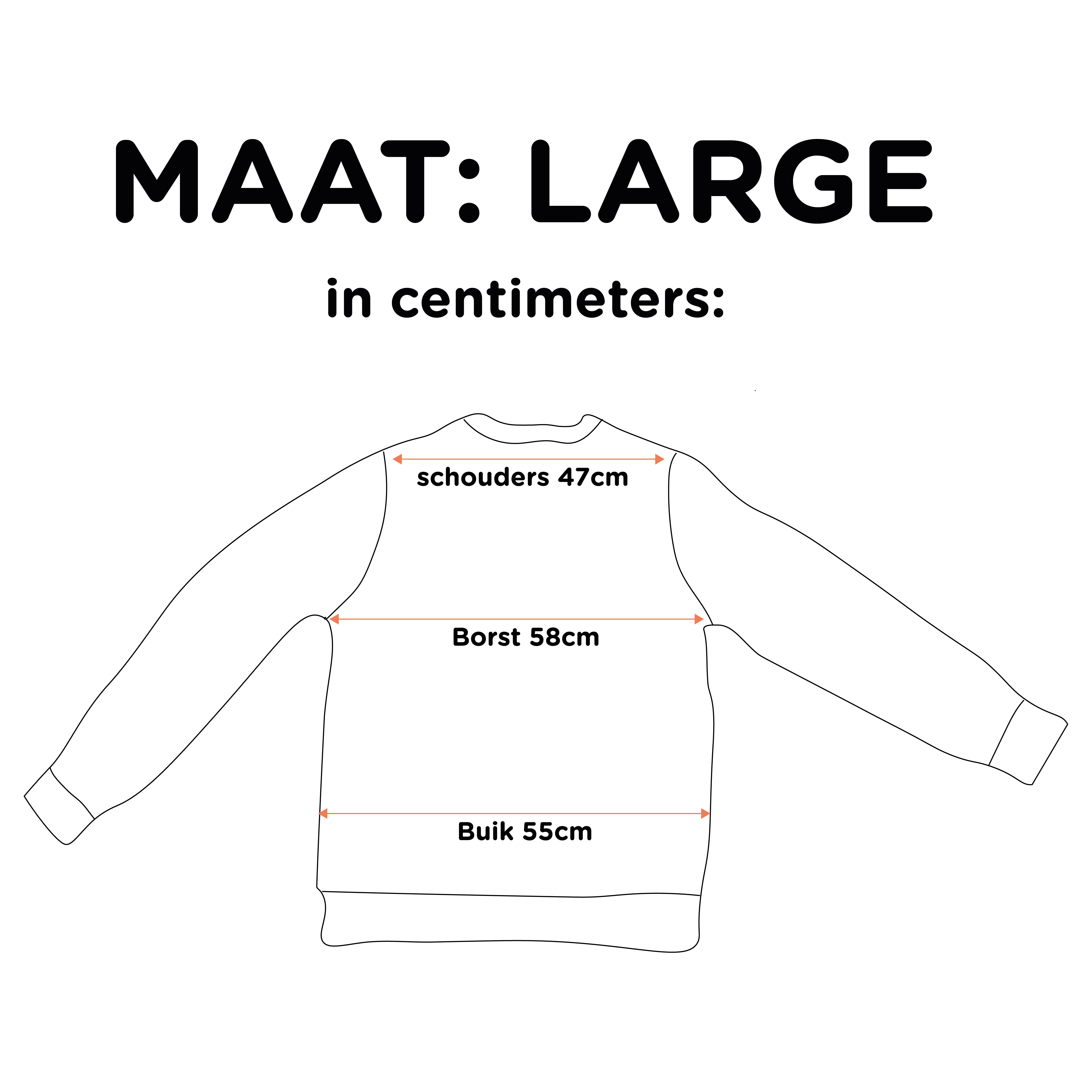 De trui heeft een normale pasvorm. U heeft gekozen voor Maat L van de trui. Maat Large in centimeters: Schouders: 47cm - Borst: 58cm - Buik: 55cm. Is dit niet de maat die u wenst? Onderstaand zijn de andere beschikbare maten. Klik op de maat die u wenst.