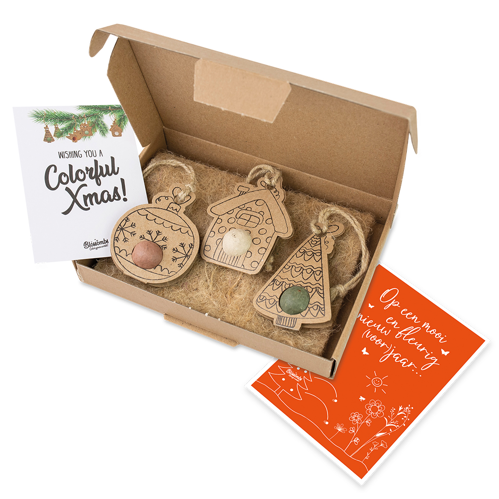 Vrolijk uw kerstboom op met deze fleurige kersthangers met bloembommetjes van Blossombs. Bewaar de bolletjes tot het voorjaar en strooi ze uit in de tuin of plant de bolletjes in een pot op uw balkon en besproei met water. Na een paar weken genieten u, de bijen en de vlinders van mooie fleurige wilde bloemen!