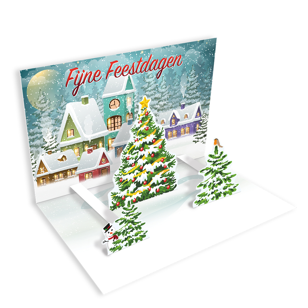 Wenskaarten set met het thema Kerst en een 3D effect aan de binnenzijde. Een leuke verrassing voor de ontvanger. Als deze kaart wordt geopend dan springen er drie kerstbomen op in een leuk winterlandschap. U kunt uw berchtje aan de binnezijde van de kaart, "in de sneeuw", schrijven.
