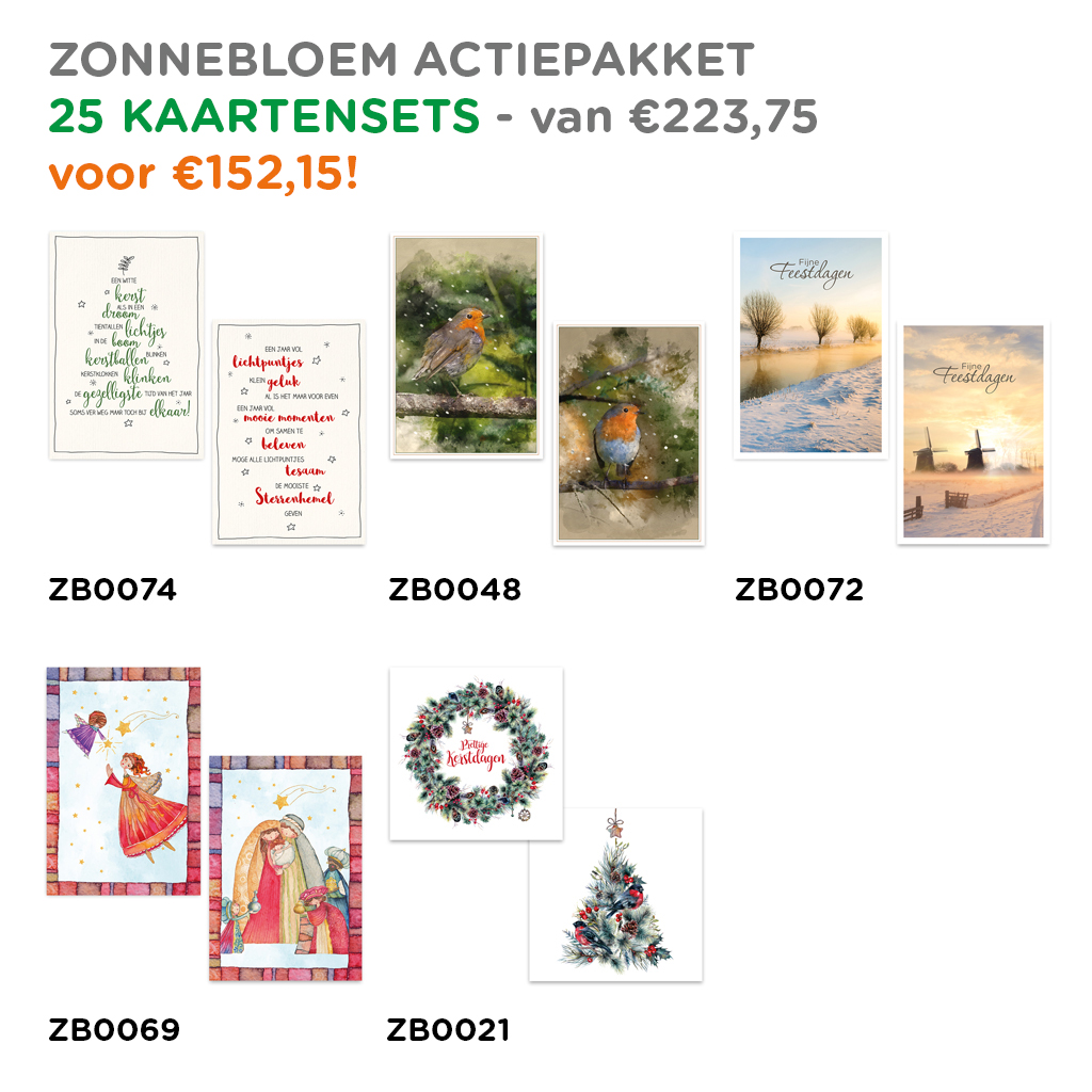 Deze aanbieding geldt alleen voor de getoonde Zonnebloem wens- en kerstkaartensets en producten in dit pakket.