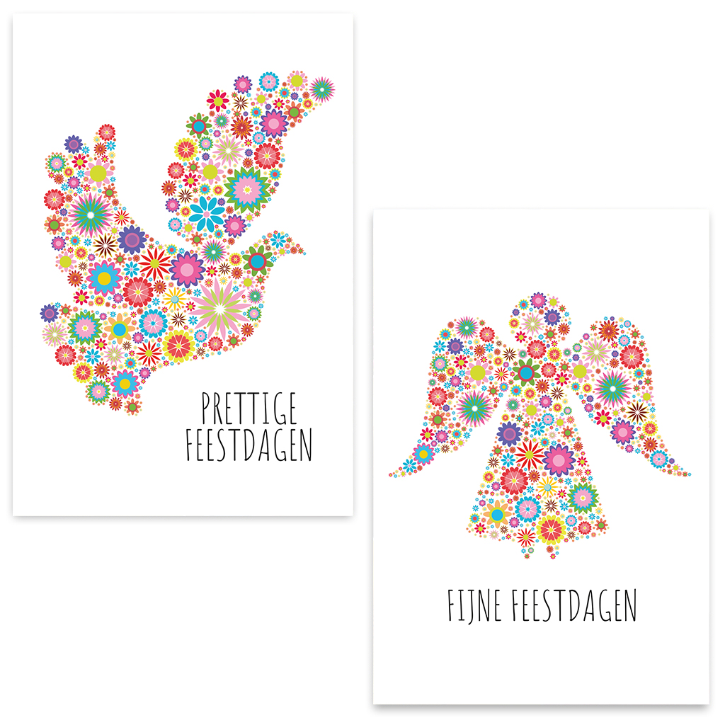 Een engel en vredesduifweergegeven in een vrolijke mix van kleurige elementen.